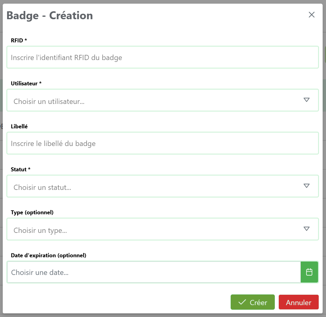 Cliquez sur le bouton de création. 2. Une fenêtre de dialogue s'ouvre avec les champs suivants : - **RFID (ID du Badge) :** Saisissez ici l'identifiant unique du badge. **Ce champ est obligatoire et ne pourra pas être modifié par la suite.** - **Libellé :** Donnez un nom facile à retenir au badge. - **Utilisateur :** Choisissez dans une liste déroulante l'utilisateur à qui attribuer le badge. - **Type et Statut :** Sélectionnez le type et le statut du badge dans les listes déroulantes. - **Date d'expiration :** Vous pouvez optionnellement définir une date à laquelle le badge deviendra invalide. 3. Validez pour enregistrer le nouveau badge.