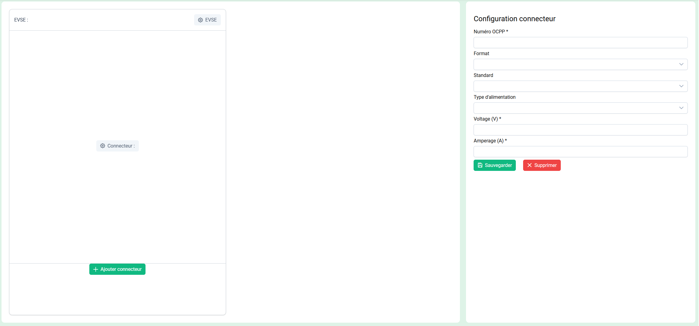 Sur cette page, vous devrez choisir un **fabricant** et un **modèle** de borne. Cette sélection préremplit les caractéristiques techniques de la borne.
