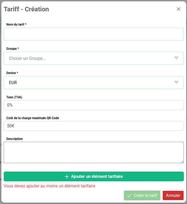 Création : Le bouton "Créer un nouveau tarif" ouvre une fenêtre de dialogue. Vous y définissez d'abord les informations générales du tarif, puis vous pouvez commencer à ajouter des "éléments tarifaires" et leurs "composants de prix".