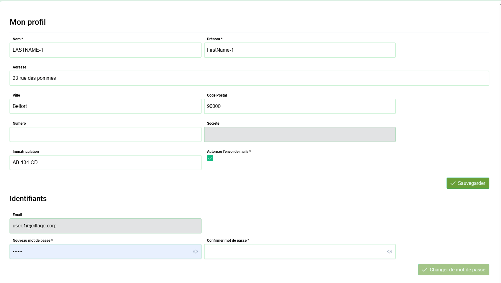 - Champs modifiables : Vous pouvez y changer votre prénom, nom, adresse, ville, code postal, plaque d'immatriculation, etc.