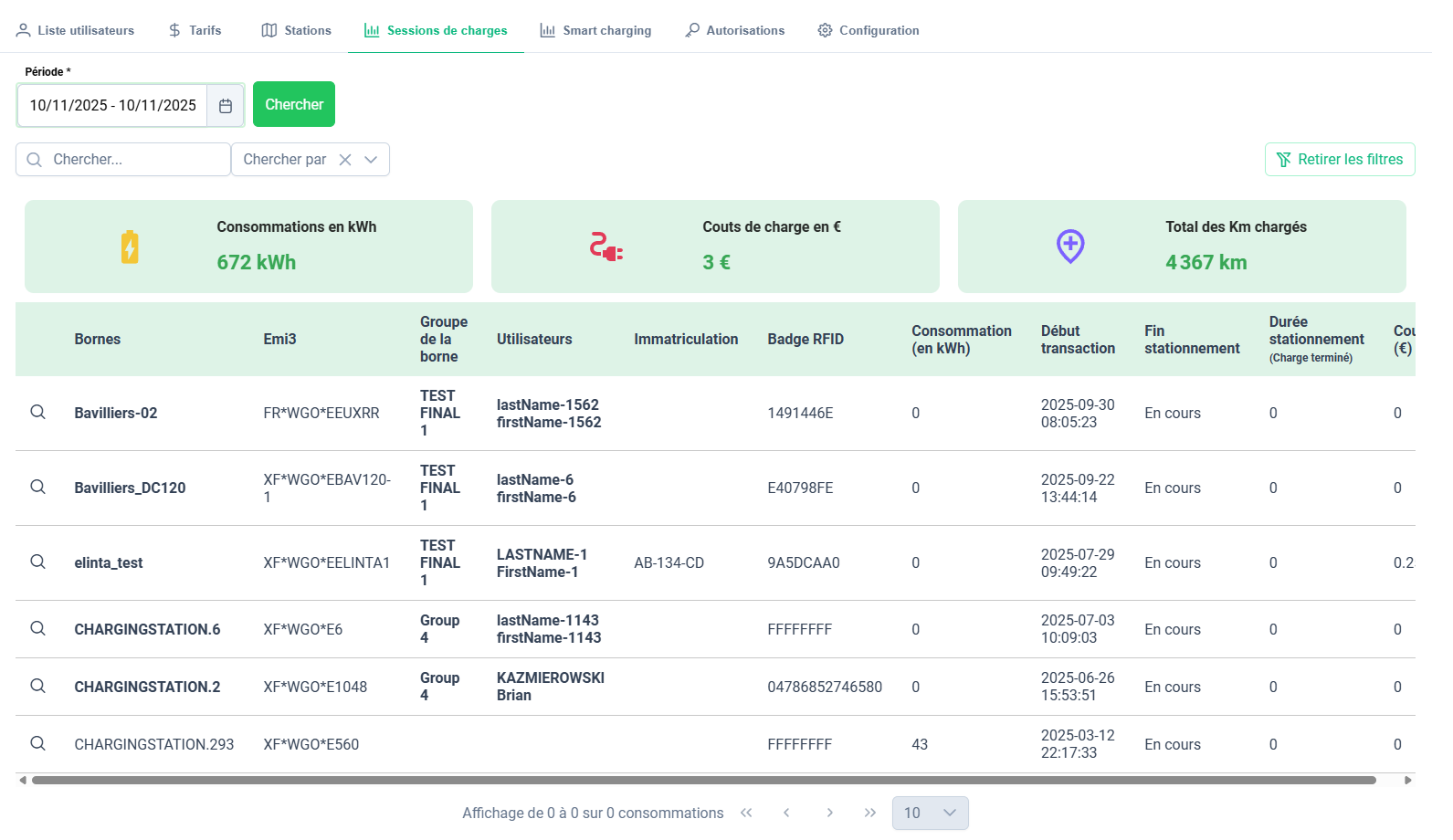 Fournit un historique détaillé de toutes les sessions de recharge effectuées par les membres de ce groupe, avec des indicateurs de performance (KPIs) de coût et de consommation.