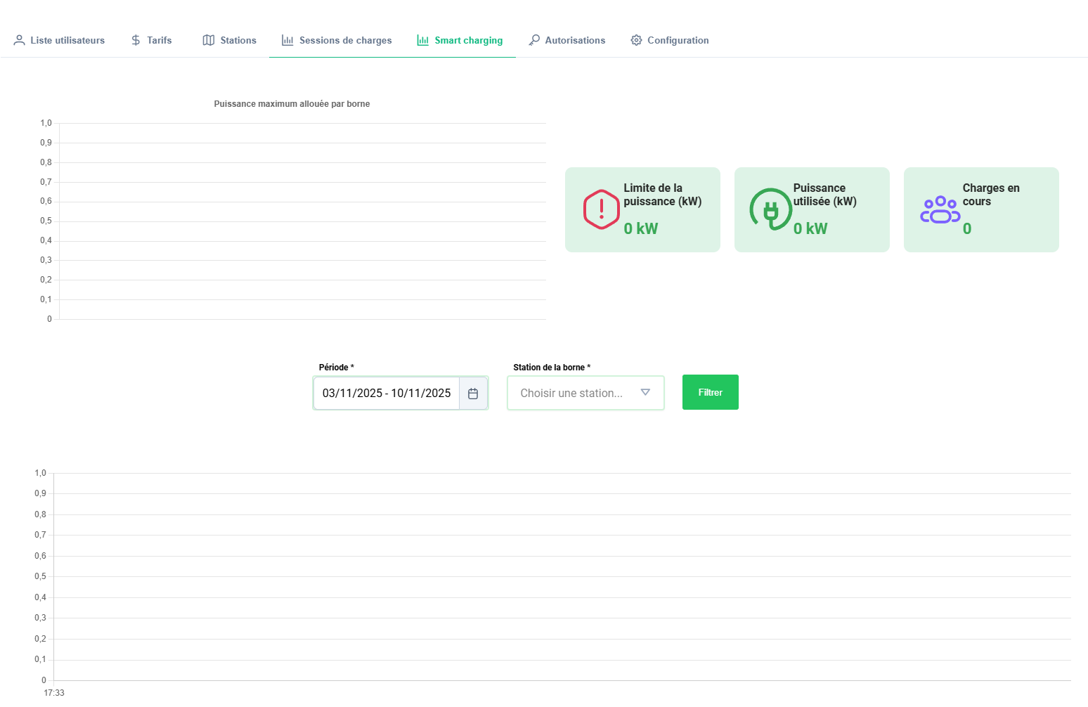 Intègre le tableau de bord de supervision du Smart Charging, automatiquement filtré pour n'afficher que les données des locations appartenant à ce groupe.