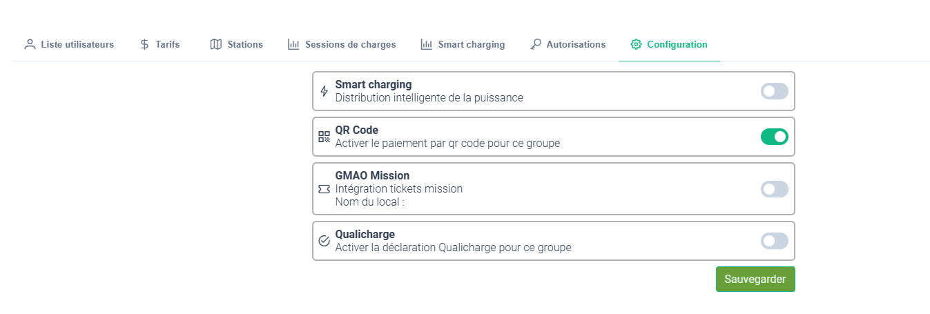 Cette section avancée gère les droits de charge entre les groupes. Elle permet de définir quels autres groupes ont l'autorisation d'utiliser les bornes de recharge appartenant à ce groupe.