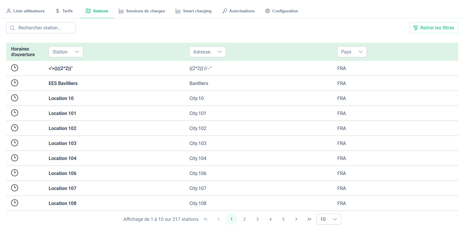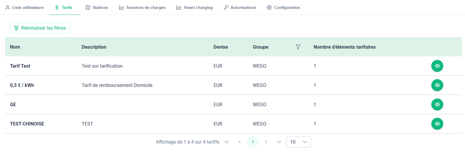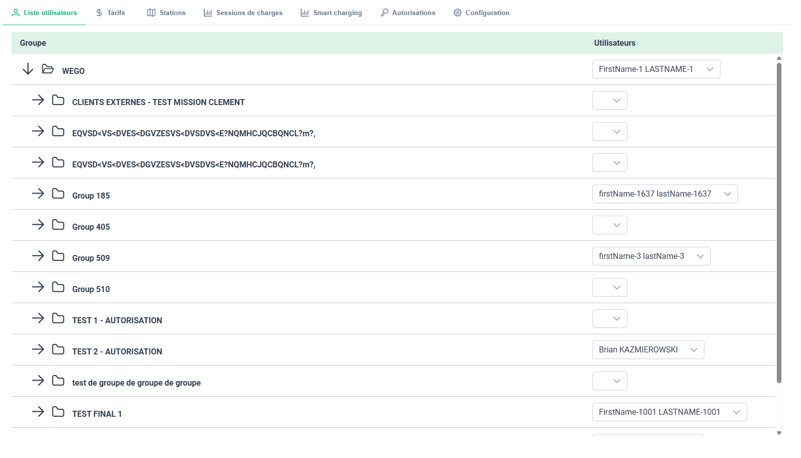 Affiche la liste des locations (sites de recharge) qui sont rattachées à ce groupe. C'est une vue filtrée de la page principale des locations.