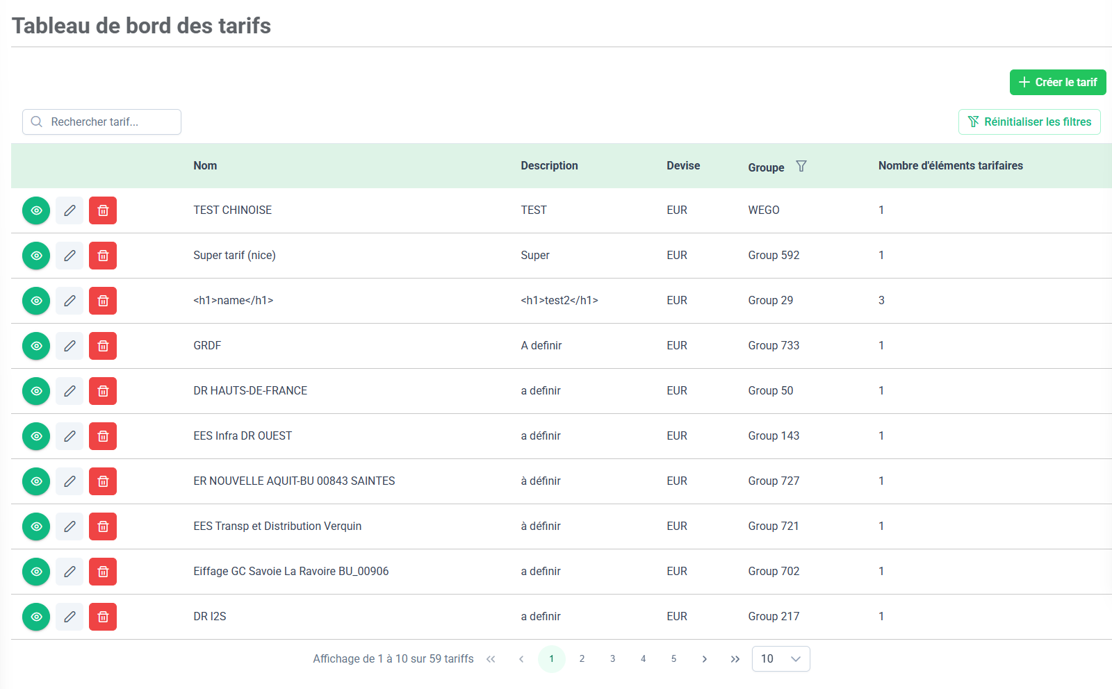 - Recherche et Filtres : Vous pouvez rechercher un tarif par son nom ou filtrer la liste par groupe.