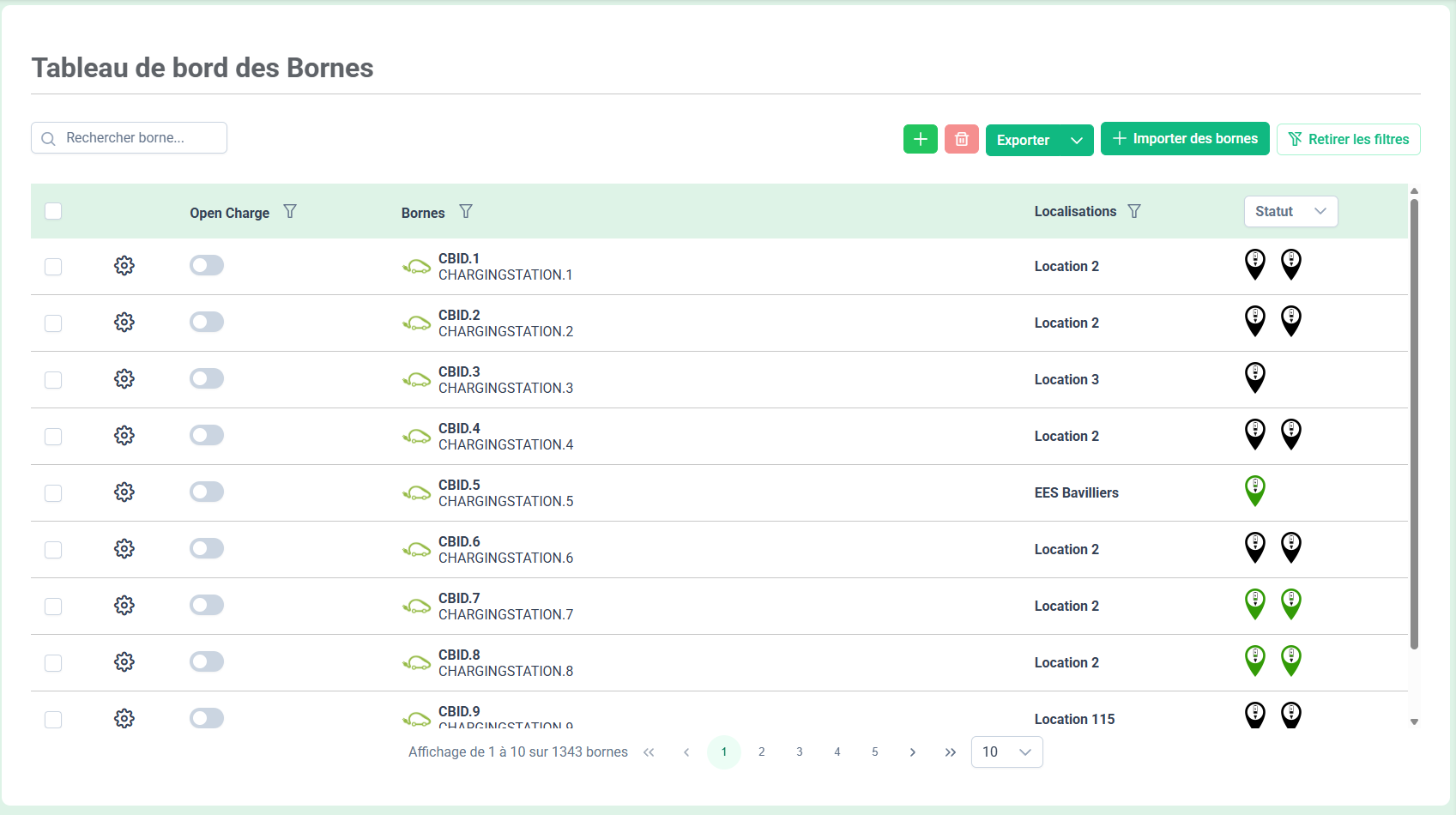 Le tableau de bord principal est une liste complète de toutes les bornes de recharge.